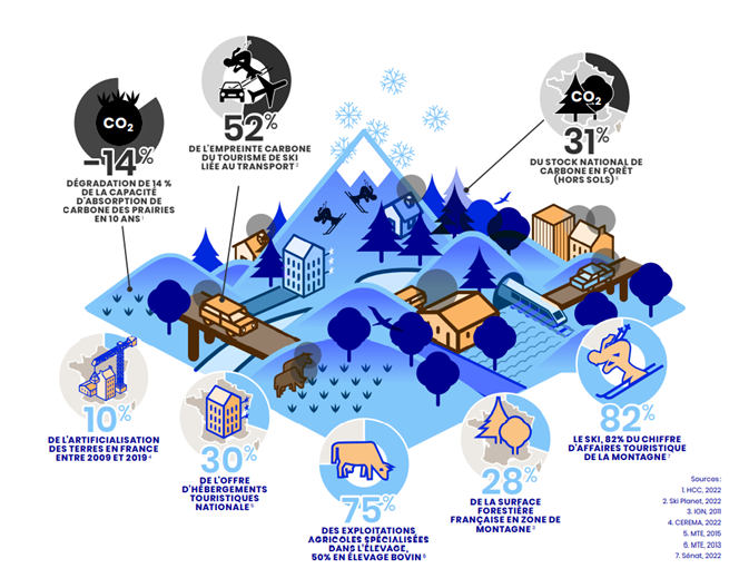 Le territoire métropolitain compte 22 % de zones montagneuses (Pyrénées, Massif Central, Corse, Alpes, Jura et Vosges) qui accueillent 7 % de la population française. Bien qu’ils soient généralement peu denses, ils concentrent de nombreux problèmes, notamment climatiques, environnementaux et économiques.